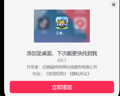 描述:调用方法后会自动添加到桌面,并弹出提示若没添加到桌面,请用户前往抖音开启桌面快捷方式权限